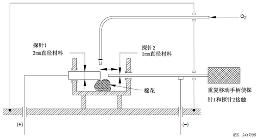 將用被測試材料制作成的兩根探針相對放置(見上圖),一根探針直徑為 1mm,另一根直徑為 3mm。用供電電源和可調(diào)電阻模擬醫(yī)用電氣設(shè)備內(nèi)部電路結(jié)構(gòu),連接至本工裝中的兩極上作為試驗電源,在靠近兩根探針的接觸表面放置一片棉花,通過管道用速度不大于 0.5m/s 的氧氣持續(xù)沖刷接觸位置。將工裝中火花點燃試驗裝置右1mm探針移向左3mm探針使它們接觸而后移開右探針再使它們斷開。在確認不會點燃火花之前應(yīng)至少進行 300 次試驗。